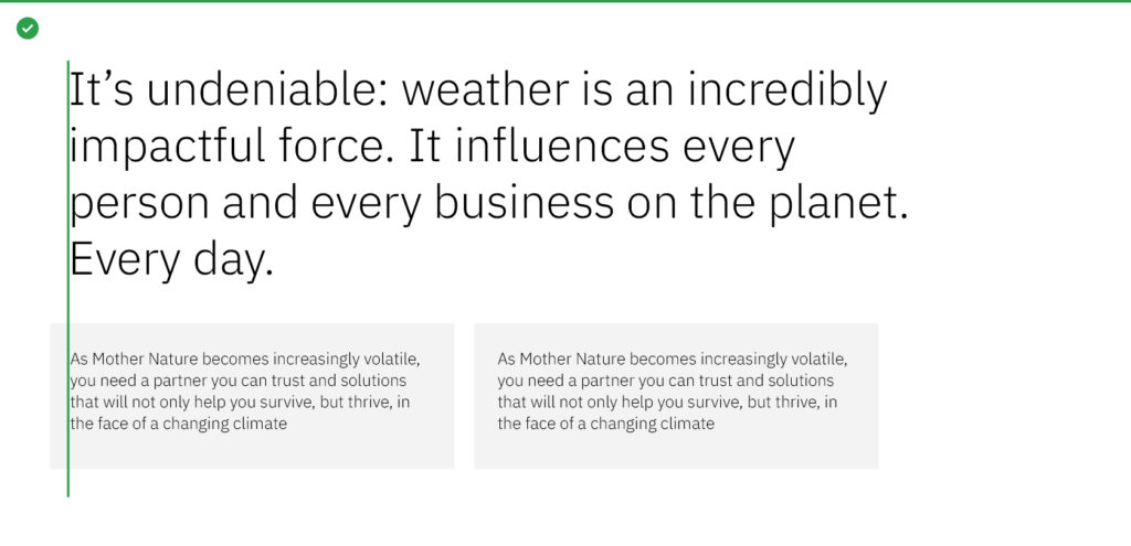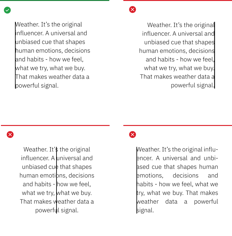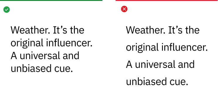 Flush left justification telegraphs our editorial lineage, our scientific roots and creates strong alignments for the eye to follow, aiding readability and organization. It is functional, timeless and to be used as our standard for all typography across The Weather Company.