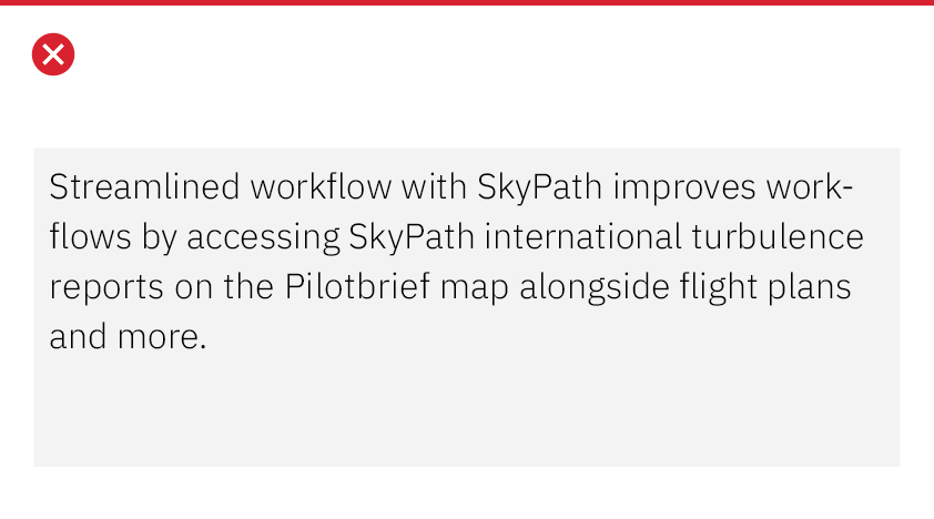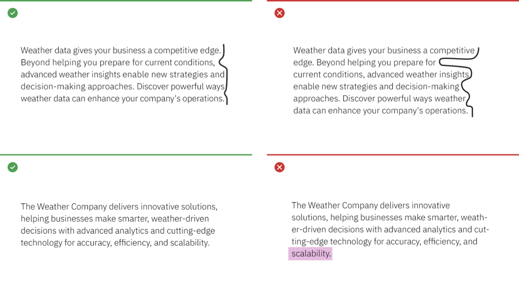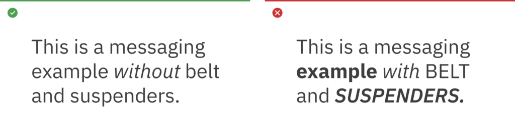 The term “belt and suspenders” refers to using multiple styles to do the same thing in typography. The Weather Company should always be essential, so keep styles to a minimum when emphasizing words in messaging.