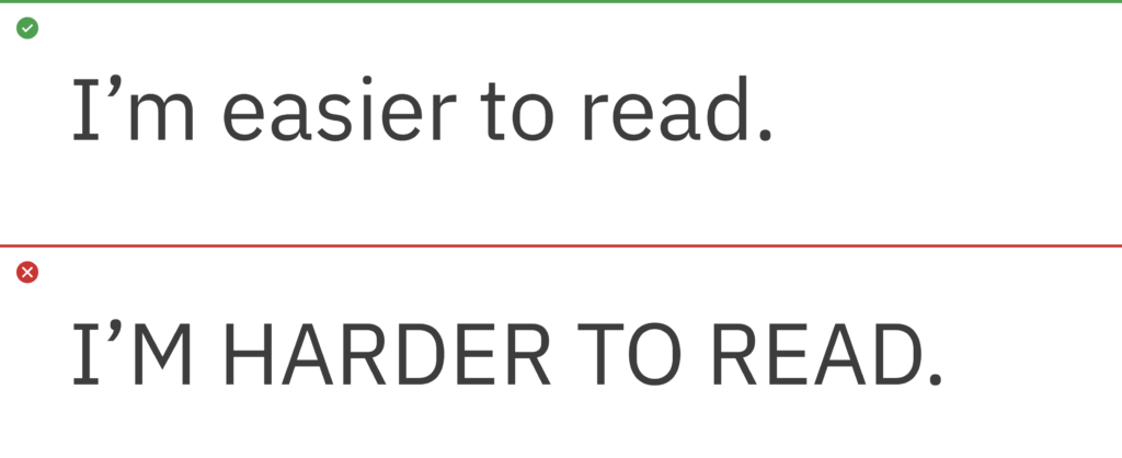 Write content in sentence case. Title case can be used in proper titles, product names and service names. Avoid the use of all uppercase or “all caps” in your typography, especially for paragraphs or text.