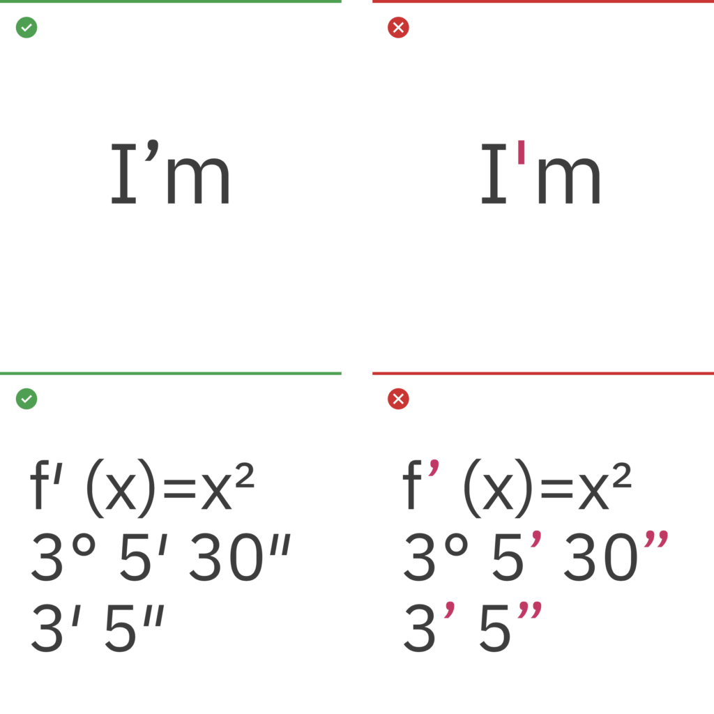 Apostrophes indicate possession, for example, Harry’s book or the boys’ coats. They can also indicate the omission of letters or numbers. Primes are commonly used for minutes, seconds, feet, inches and degrees. Lucky for us, Plex includes them. Many fonts don’t.