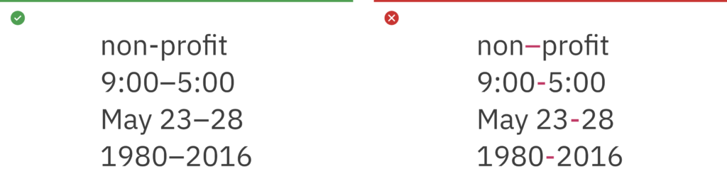 Some examples of correct use of hyphens and en dashes are shown here. An en dash is used to span or ranges of numbers (1945–1975) and the hyphen is for compound terms (check-in).